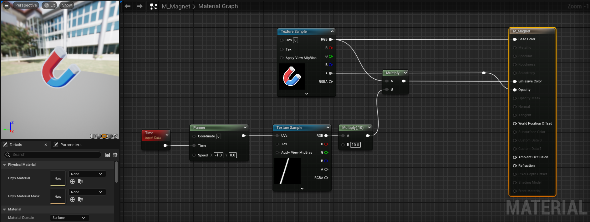 - Panner의 아웃핀을 텍스쳐 샘플의 UVs 인풋에 연결